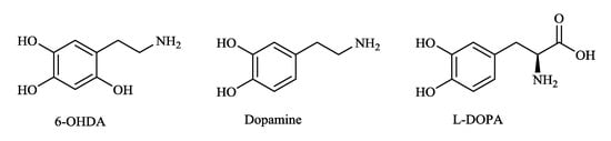 The main aspect of oxidative stress in PD has been investigated with toxin-based models such as 1-methyl-4-phenyl-1,2,3,6-tetrahydropyridine (MPTP) and 6-hydroxydopamine (6-OHDA). 6-OHDA (Figure 1) is a neurotoxin, which is capable of generating ROS in neurons, and is detected in the urine of PD patients treated with long-term L-3,4-dihydroxyphenylalanine (L-DOPA) (Figure 1), which is the natural precursor of dopamine (Figure 1) and the typically prescribed drug for the symptomatic treatment of PD. Neurodegeneration with a 6-OHDA-based model can mimic idiopathic PD pathogenesis in vitro, as well as in vivo. The primary advantages of this model are measurable motor deficit (rotation) and proven usage in the pharmacological screening of compounds effective on dopamine and its receptors [17,18,19,20].