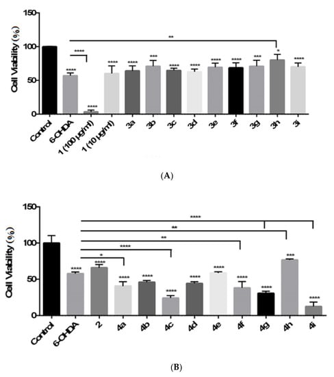 Neuroprotective effects of compounds 1 and 3a–i (A); 2 and 4a–i (B) against 6-OHDA induced neurotoxicity. PC-12 Adh cells were treated with 100 µg/mL concentration of the compounds for 6 h before exposure to 150 µM 6-OHDA for 24 h. The cell viability was detected at the 24th hour. The results of the cell viability were presented as a % of the control (the O.D. value). Data are shown as mean ± SD of three experiments. ((n = 8), p > 0.05 n.s., * p < 0.05, ** p < 0.01, *** p < 0.001, and **** p < 0.0001).