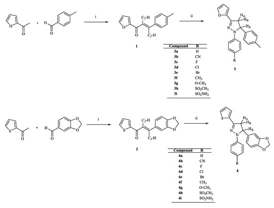 The synthesis of new pyrazoline derivatives (3a–i, 4a–i) followed the general pathway depicted in Scheme 1. Initially, 1,3-diaryl-substituted chalcones (1, 2) were synthesized via the base-catalyzed Claisen–Schmidt condensation of 2-acetylfuran/2-acetylthiophene with the appropriate aromatic aldehydes [29,30,31,32]. Then, the final compounds, 1-(phenyl/4-substituted phenyl)-3-(2-furanyl/thienyl)-5-aryl-2-pyrazolines (3a–i, 4a–i), were obtained via the cyclization of the chalcones (1, 2) with suitable phenylhydrazine hydrochloride derivatives in the presence of hot acetic acid [33].