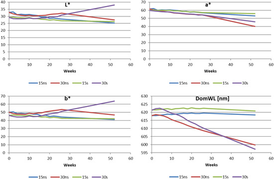 After 24 weeks of storage, the differences in lightness ΔL* were in the range −4.4 to +0.4 units, and after one year of storage the ΔL* was between −7.6 and +8.7, and only the liqueur with sugar, stored at 30 °C, was found to brighten. The red parameter (a*) decreased after 24 weeks by 2.2–4.2 units at 15 °C and 5.8–7.1 units at 30 °C, and after 52 weeks by 4.0–8.5 and 14.2–21.6 units respectively. Larger changes in this parameter were observed for liqueurs without sugar added. The color parameter b* (yellowness) increased during storage of liqueurs at 30 °C (Δa = 2.6 ÷ 3.0 units), and decreased at 15 °C (Δa = 2.8 ÷ 5.3 units). After one year only in the sample with added sugar stored at 30 °C was an increase of parameter b* observed (Δb* = 17.4). Also, the dominant wavelength decreased, but at 15 °C values were irrelevant (ΔDomWL < 1), and at 30 °C the difference compared to initial values was approximately 10 units in the samples stored at 15 °C and 18–24 units in the samples stored at 30 °C.