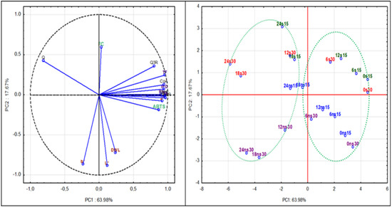 Principal Component Analysis (PCA) loadings plot and score plot of major components, color attributes and antioxidant activity of cherry liqueurs with (s) and without sugar (ns) stored at 15 °C (15) and 30 °C (30) during 24 weeks (0, 6, 12, 18, 24).