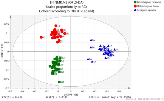 An OPLS-DA model was built using the 1H-NMR data of the honey samples. As shown by the OPLS-DA score plot (Figure 1), the honey samples were classified into three separate groups with 100% correct classification (Table 1) according to their bee species origins. Honey samples from T. apicalis were discriminated from those of H. itama and G. thoracica honey by PC1, while H. itama honey samples were discriminated from those of G. thoracica by PC2.