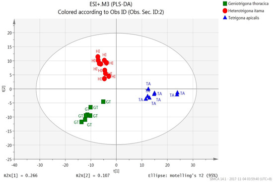 The PLS-DA score plots for m/z values of both ESI+ (Figure 2) and ESI− precursor ions (Figure 3) for the honey samples were clearly classified into three discernible groups with 100% correct classification (Table 2) according to their bee species origins. T. apicalis group was discriminated from that of H. itama and G. thoracica by PC1, while H. itama group was discriminated from G. thoracica by PC2. Both PLS-DA models (ESI+: R2Y = 0.922, Q2 = 0.833, R2Y − Q2 = 0.089; ESI−: R2Y = 0.989, Q2 = 0.976, R2Y − Q2 = 0.013) demonstrated the optimum goodness of fit and satisfied the criteria for good predictability.