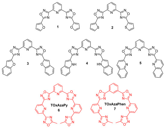 Structures of the newly synthesized non-macrocyclic penta-hetero-aromatics 1–5 and hepta-hetero-aromatics TOxAzaPy (6) and TOxAzaPhen (7).