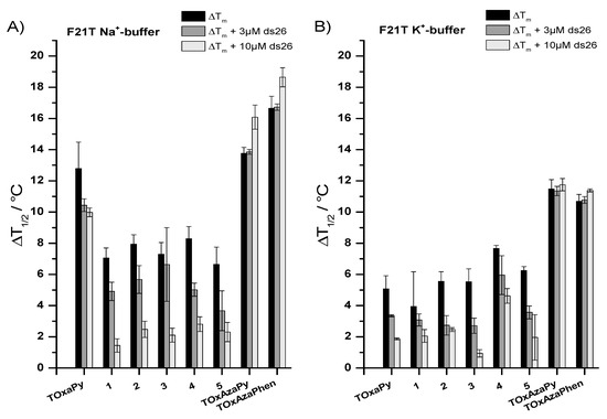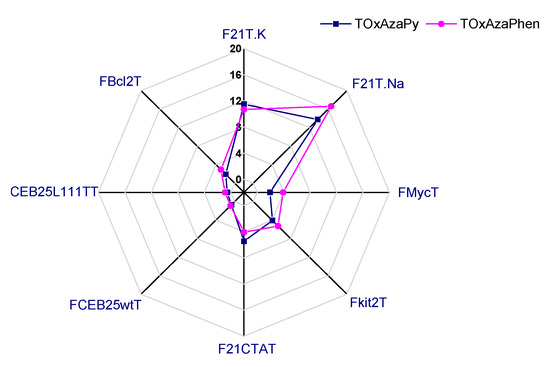 All the newly synthesized compounds were able to stabilize F21T and the stabilization was higher in Na+- than in K+-rich buffer. The ΔTm values of F21T for the penta-aryl compounds 1–5 ranged from 6.6 to 8.3 °C in Na+-rich buffer and from 3.9 to 7.7 °C in K+-rich buffer (Figure 3). Following the same trend, the hepta-aryl ligands TOxAzaPy and TOxAzaPhen showed much higher stabilization ability than the penta-aryl counterparts, with ΔTm values ranging from 13.8 to 16.6 °C in Na+-rich buffer (Figure 3A) and from 10.8 to 11.5 °C in K+-rich buffer (Figure 3B), respectively. This trend of higher stabilization in Na+-rich buffer was previously observed for the hepta-aryl TOxaPy [21], used as a reference compound in this study, although in this specific case the differences in stabilization in the two buffer conditions are less pronounced. As suggested for TOxaPy, these results point out the unusual behavior of these heteroaryl compounds to preferentially recognize and stabilize the antiparallel form of the telomeric sequence (predominantly formed in Na+-buffer) more than the [3 + 1] hybrid conformation adopted in K+-rich buffer. Based on these results, we decided to analyze our compounds with additional FRET melting studies in the presence of the highly polymorphic telomeric sequence.