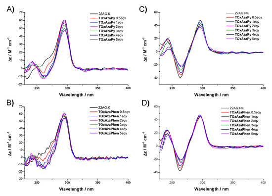 The same experiments were carried out in the presence of 22AG in Na+-rich buffer. As reported in the literature, the main conformation generated by the telomeric sequence in this condition is an antiparallel structure characterized by positive bands at 295 nm and 245 nm and a negative band at 265 nm [32,37]. Upon addition of TOxAzaPy, an increase in intensity of the bands at 295 nm, 265 nm, and 245 nm together with a 3 nm hypochromic shift at 295 nm and a 3 nm bathochromic shift at 265 nm was recorded. The first equivalent of ligand induced an increase of the intensity of the bands at 295 nm and 245 nm, differently higher ligand concentrations reduced the band intensities to lower values as compared to the initial ellipticity together with a 6 nm bathochromic shift at 245 nm. Increasing concentration of ligand produced a continuous increasing of the intensity of the band at 265 nm (Figure 6C). Two neat isoelliptical points are visible at 275 nm and 285 nm and a not clear isoelliptical point around 250 nm. TOxAzaPhen showed a similar behavior (Figure 6D) with a mild increase in intensity of the band at 295 nm, a strong increase at 265 nm, and a strong decrease at 245 nm. Two clear isoelliptical points are visible at 275 nm and at 285 nm and a not clear isoelliptical point around 255 nm.