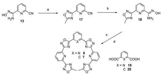 TOxAzaPy (6) and TOxAzaPhen (7) were synthesized according to the stepwise protocol shown in Scheme 2. The picolin-cyano-monoamidoxime 13 was converted into oxadiazole 17 exploiting a one-pot, two-step synthesis. Compound 13 was firstly O-acylated by acetic anhydride and then cycloaromatized in acetic acid to give 17. Hydroxylamine addition in aqueous ethanol, yielded the formation and the precipitation of the amidoxime 18 as white crystals, directly used in the last step, without further purification. The dicarboxylic acid 19 or 20 was activated to perform the O-acylation and the cycloaromatization in a single step, to achieve the final oxadiazoles 6 and 7. A change in solvent, from DMF to DMPU, implemented the reaction yield of the final cyclization reaction (Table 2).