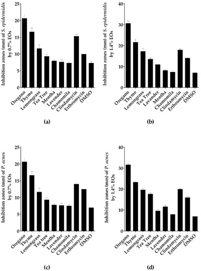 Oregano EO exhibited the largest inhibition zone among the tested oils. Antibacterial activity of the screened EOs using agar disc diffusion method against (a) S. epidermidis with EOs at concentration of 0.7%; (b) S. epidermidis with EOs at concentration of 1.4%; (c) P. acnes with EOs at concentration of 0.7%; (d) P. acnes with EOs at concentration of 1.4%. Data is represented as means of inhibition zones (mm) ± SD. Controls used were clindamycin and erythromycin as positive control, while DMSO as negative control.