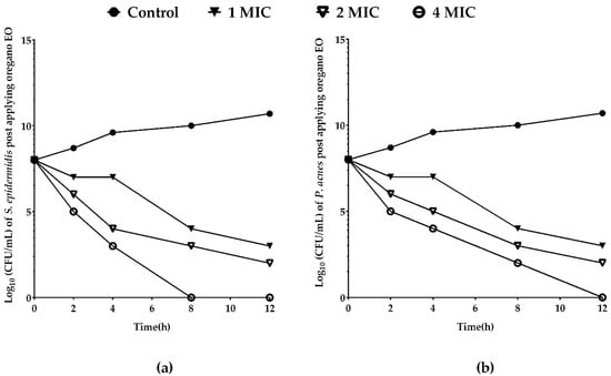 Time-kill kinetics assay was performed for oregano EO against S. epidermidis and P. acnes as described previously [40]. Bacterial suspensions at a final concentration of 108 CFU/mL were used as the initial inoculum. We assayed oregano EO killing time at concentrations of mg/mL (0.035%), mg/mL (0.07%), and mg/mL (0.14%) equivalent to 1, 2, and 4 MIC. We incubated different concentrations of oregano EO with the two bacterial cultures and measured killing capacity at 0, 1, 2, 4, 8, 12, and 24 h using broth micro-dilution method. At each time point, we used 50 µL of the assay solution to make ten-fold serial dilutions and performed viable counts on BHI and RCM agar plates for the respective bacteria. We incubated the agar plates at 25 °C for 24 h under aerobic conditions and 37 °C under anaerobic conditions for 48 h for each respective bacterium. We expressed viable count of each bacterium as CFU/mL. We used DMSO solvent and equivalent broth as negative controls. Each concentration of EO was assayed as triplicate and the entire assay was repeated three independent times.