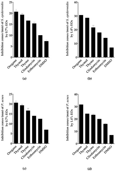Thymol exhibited lower inhibition zone than oregano EO. Antibacterial activity of thymol and the most bioactive EOs using disc diffusion method (zone of inhibition in mm) against (a) S. epidermidis with thymol and EOs at concentration of 0.7%; (b) S. epidermidis with thymol and EOs at concentration of 1.4%; (c) P. acnes with thymol and EOs at concentration of 0.7%; (d) P. acnes with thymol and EOs at concentration of 1.4%. Data is represented as means of inhibition zones (mm) ± SD. Controls used were clindamycin and erythromycin as positive control with DMSO as negative control.
