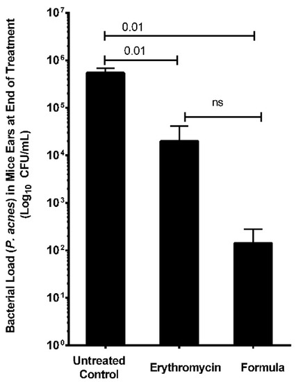 The in vivo antimicrobial activity of oregano EO nanoemulsion was assessed where bacterial counts of P. acnes dropped from 1 × 108 to 4.3 × 101 CFU/mL post-treatment with 0.672 mg/mL of oregano nanoemulsion (Figure 6). In contrast, the bacterial number for the negative control group (treated with PBS buffer) was maintained at 5 × 105 CFU/mL, whereas the positive control treated with erythromycin solution reduced the bacterial number to 3.5 × 103 CFU/mL.