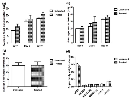 (a) Average food consumption, (b) average water intakes, (c) average body weight and (d) relative organ weight to body weight ratio of liver, spleen, kidneys, heart and lungs of untreated rats and rats given 5000 mg/kg of C. nutans water leaf extract.