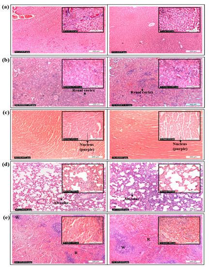 Microscopic observation of the hearts from both groups of animals showed normal myocardial fibre appearances, as depicted in Figure 2c. Structurally, a normal heart will have well-connected intercalated discs, and the filaments are normally arranged with no swelling [19]. Damaged muscle fibres in the heart will usually fluoresce under hematoxylin and eosin staining [19], and this was not reflected in any of the animals. No signs of inflammation or increased interstitial space were observed in the heart tissues of the treated animals. On examination, the lungs of the treated animals (Figure 2d) appeared normal with thin inter-alveolar septa, normal clear alveoli and alveolar sacs, and there was no presence of inflammatory cells, such as neutrophils, or thickening of the alveolar septa [20]. Lastly, there were no differences between the spleens of the animals (Figure 2e). Spleen tissues that are damaged due to toxic substances will be presented with activated germinal centres of the white pulp, megakaryocytosis and eosinophil-filled red pulp [21]. However, these were not observed in the histopathological analysis of the spleens of treated animals; no disruption in the microstructure nor the presence of inflammatory cells, edema or necrosis were noted, and all the white and red pulps were enclosed by a capsule of dense connective tissue [21]. Likewise, there was no significant difference in the relative organ weight (Figure 1) of all the organs between the untreated and treated animal groups, which further supported the microscopic observations of the individual organs, whereby all showed normal architecture. Moreover, no leukocytes infiltration was noted.