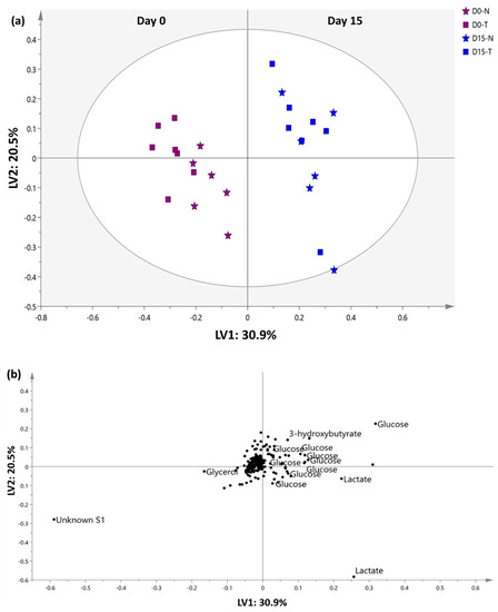 A multivariate data analysis (MVA) tool was then coupled with 1H-NMR data to efficiently establish a relevant summary from the 1H-NMR spectra data for serum and to minimize any possible biases. Partial least squares discriminant analysis (PLS-DA), a supervised projection model, was performed as shown in Figure 3 to discriminate the metabolic phenotypes and the metabolite biomarker changes in serum of untreated and treated groups that was collected on Day 0 and Day 15. Model validation, such as cross validation and response permutation testing, was performed and it validated that the generated PLS-DA model exhibited a good performance and predictive ability (R2Y = 0.931, Q2Y = 0.865, cross validation analysis of variance (CVANOVA) with p < 0.05, new estimated R2Y intercept value < 0.5 and new permuted Q2Y intercept < 0.05) [24].