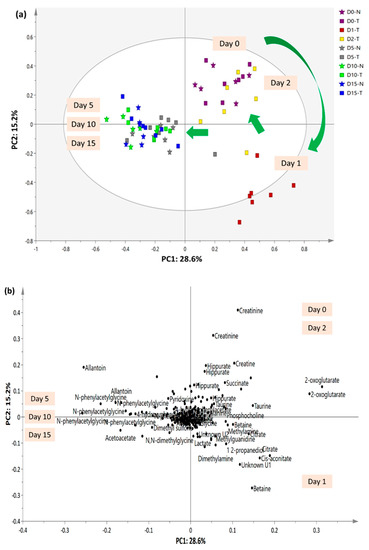 Principal component analysis (PCA) (a) score and (b) loading plots of urinary profiles trajectory trend of the untreated and treated groups collected on Day 0, 1, 2, 5, 10 and 15.
