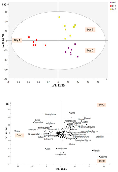 PLS-DA (a) score and (b) loading plots of urinary profiles trajectory trend of the treated groups collected on Day 0, 1, and 2.