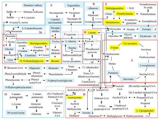The schematic diagram of the suggested metabolite pathway based on urine collected from both untreated and treated rats. The metabolites highlighted in blue are metabolites successfully identified from the urine of both untreated and treated rats. The metabolites highlighted in yellow are metabolites that showed significantly greater intensities in urine of treated rat collected on Day 1. A: TCA cycle, B: Phenylalanine metabolism, C: Glycine, serine, threonine metabolism, D: Propanoate metabolism, E: Methane metabolism, F: Nicotinate & nicotinamide metabolism, G: Arginine & proline metabolism, H: Glycolysis, I: Alanine, aspartate & glutamate metabolism, J: Glyoxylate & dicarboxylate metabolism, K: Purine metabolism, L: Taurine & hypotaurine metabolism, M: Cysteine & methionine metabolism, N: Glycerophospholipid metabolism, O: Lysine degradation, P: Sulfur metabolism, Q: Vitamin B6 metabolism.