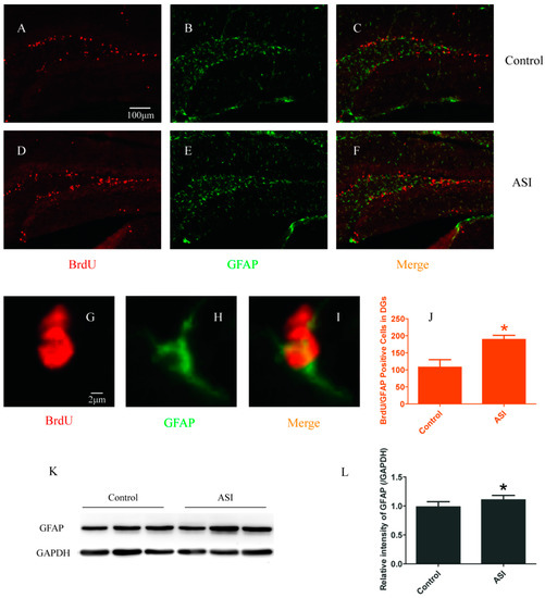 ASI (25 mg/kg) increased the total number of proliferative radial glia-like cells (BrdU+/GFAP+). (A–I) Confocal images of BrdU (red) and GFAP (green) immunostaining: (A–C) Control group; (D–F) ASI group; and (G–I) enlarged images of the cells from ASI group. (A–F) Scale bar = 100 μm. (G–I) Scale bar = 2 μm. (J) Quantification of BrdU+/GFAP+ double immunopositive cells in two groups (n = 4/group). (K) Western blotting analysis of GFAP in hippocampus. (L) Gray intensity analysis of GFAP in hippocampus (n = 8/group). * p < 0.05. The data are presented as mean ± SD.