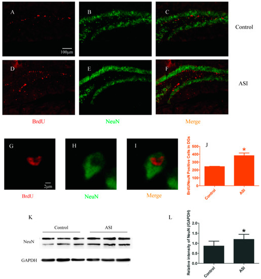 To examine the effect of ASI on proliferative radial glia-like cells and newly generated neurons in DGs, BrdU+/GFAP+ and BrdU+/NeuN+ immunopositive cells were counted, respectively. Confocal microscopic results showed that GFAP+ and NeuN+ cells were abundant in the granular cell layer of the DGs in both groups (Figure 2B,E,H and Figure 3B,E,H). Meanwhile, the numbers of BrdU+ cells with GFAP (Control vs. ASI group, respectively, n = 4 per group, p < 0.05) (Figure 2C,F,I,J) and NeuN (Control vs. ASI group, respectively, n = 4 per group, p < 0.05) (Figure 3C,F,I,J) expression were significantly increased in the ASI group mice. Consistently, the total amount of GFAP and NeuN proteins were also elevated remarkably in the hippocampus in ASI group mice (n = 8 per group, p < 0.05) (Figure 2K,L and Figure 3K,L). These results indicated that ASI increased proliferative gila-like cells and newly generated neurons in the subgranular zone (SGZ).