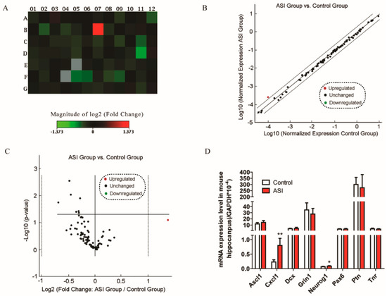 The effect of ASI (25 mg/kg) on eighty-four neurogenesis related genes. (A) The heat map provides a graphical representation of fold change between two groups overlaid onto PCRarray plate layout; (B) The scatter plot compares the normalized expression of every gene on the array between two groups by plotting one against another to quickly visualize gene expression changes. The central line indicated unchanged gene expression; (C) The volcano plot displays statistical significance versus fold-change on the y- and x-axes, respectively, enabling identification of genes with significant changes; (D) Verification of mRNA expression levels in mouse hippocampus; n = 6/group. * p < 0.05; ** p < 0.01. The data are presented as mean ± SD.