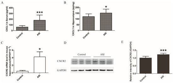 To detect the effect of ASI on CXCL1, concentrations of mouse chemokine in serum and hippocampi were measured using a CXCL1-specific ELISA kit (Boster Biological Technology, Wuhan, China), following the manufacturer’s instructions.