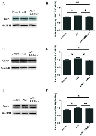 To examine the effect of ASI on the expression of proteins, samples from hippocampi were homogenized, sonicated, and subjected to Western blotting analysis. Twenty micrograms of proteins from each sample were separated on 10–15% SDS-PAGE. After being transferred onto PVDF membranes, the proteins were incubated with respective primary antibodies against DCX (1:1000, v/v), GFAP (1:1000, v/v), NeuN (1:1000, v/v), CXCR2 (1:1000; v/v, Abcam cat#14935) horseradish peroxidase-conjugated secondary antibodies sequentially as described previously [21]. The protein bands were visualized by an ECL-prime kit and quantified with ImageJ 1.46r software (NIH, Bethesda, MD, USA).