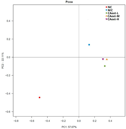 Principal coordinate analysis (PCoA) plots based on the OTU abundance of gut microbiota of each mouse. The closer the spatial distribution between spots, the greater the bacterial similarity among different groups. NC, normal control, mice were fed with a normal chow and intragastrically administered 20 mL/kg saline; MC, model control, mice were fed with a high-fat feed and intragastrically administered 20 mL/kg saline; CAext-L, CAext-M, CAext-H mice were fed with a high-fat feed and intragastrically administered 10 mg/(kg·d), 15 mg/(kg·d), and 20 mg/(kg·d) Canarium album extract (CAext), respectively.