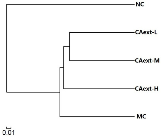 Clustering analysis dendrogram of gut microbiota based on distances among different groups. NC, normal control, mice were fed with a normal chow and intragastrically administered 20 mL/kg saline; MC, model control, mice were fed with a high-fat feed and intragastrically administered 20 mL/kg saline; CAext-L, CAext-M, CAext-H mice were fed with a high-fat feed and intragastrically administered 10 mg/(kg·d), 15 mg/(kg·d), and 20 mg/(kg·d) Canarium album extract (CAext), respectively.