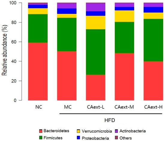 Analysis of relative bacterial abundance at the phylum level revealed the major differences of the dominant bacterial population among groups (Figure 3). Compared to the NC group, the relative abundance of Bacteroidetes was significantly reduced, whereas that of Firmicutes increased in all HFD-fed groups, especially in CAext-L and CAext-H group (p < 0.05). The Firmicutes to Bacteroidetes (F/B) ratio were respectively 0.50, 0.69, 1.79, 0.67, 1.09 in NC, MC, CAext-L, CAext-M, CAext-H group. Furthermore, the relative abundance of Verrucomicrobia was statistically higher in CAext-L and CAext-M groups compared with the NC or MC group (p < 0.05).