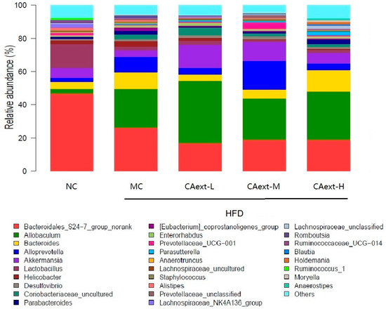 Relative abundance at the genus level of gut microbiota among different groups. Other genera refer to a taxa with a relative abundance ≤1% in any sample. NC, normal control, mice were fed with a normal chow and intragastrically administered 20 mL/kg saline; MC, model control, mice were fed with a high-fat feed and intragastrically administered 20 mL/kg saline; CAext-L, CAext-M, CAext-H mice were fed with a high-fat feed and intragastrically administered 10 mg/(kg·d), 15 mg/(kg·d), and 20 mg/(kg·d) Canarium album extract (CAext), respectively.
