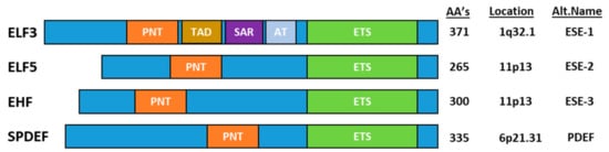 Chicago/Turabian StyleLuk, Ian Y., Camilla M. Reehorst, and John M. Mariadason. 2018. "ELF3, ELF5, EHF and SPDEF Transcription Factors in Tissue Homeostasis and Cancer" Molecules 23, no. 9: 2191. https://doi.org/10.3390/molecules23092191