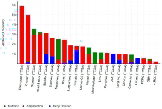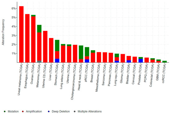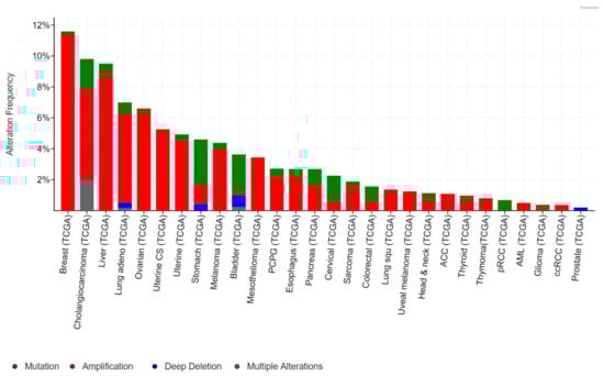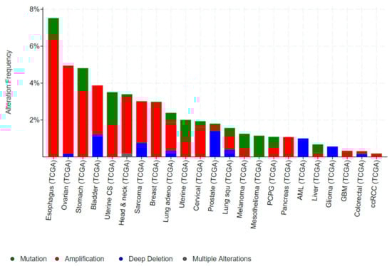 - Gao, J.; Aksoy, B.A.; Dogrusoz, U.; Dresdner, G.; Gross, B.; Sumer, S.O.; Sun, Y.; Jacobsen, A.; Sinha, R.; Larsson, E.; et al. Integrative analysis of complex cancer genomics and clinical profiles using the cBioPortal. Sci. Signal. 2013, 6, pl1. [Google Scholar] [CrossRef] [PubMed]