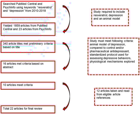 Articles were searched for using the databases PubMed Central and PsycInfo with the latest search date of August 2018. The phrases “resveratrol” and “depression” were entered into the search engine with the limitations of the years 2010 to 2018. This yielded 1859 articles from PubMed Central and 23 articles from PsycInfo. The titles of the articles were reviewed to determine if the study involved resveratrol and depression using an animal model. Based on this, 340 articles were chosen, and their abstracts were reviewed to inquire if they included resveratrol related to behavioral symptoms of depression or physical parameters of depression. Sixteen articles were read in depth to determine if they (a) included an animal model of depression treated with resveratrol and compared to a control and/or pharmaceutical antidepressant; (b) examined depressive behaviors using standardized protocols; and (c) explored the physiological mechanisms. Ten articles were established as eligible based on these methods, while 12 articles were chosen from the references of others, yielding a total of 22 articles for final review (Figure 1). The results of each study were reported based on mean differences with an alpha level of 0.01 or 0.05 based on the parameters set by each study author. Some studies had a broader focus that did not fit within the context of this review, and thus only those results that corresponded to our specific objectives were cited (Table 1).