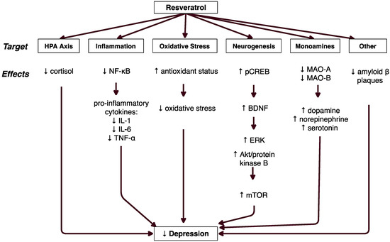 Much research has focused upon the association between inflammation and depression, and results show that regardless of a comorbid medical illness, inflammation is often present in depressed patients 41]. While it is unclear whether inflammation causes depression or the reverse, it is well known that pro-inflammatory cytokines have effects that could contribute to depressive symptoms [75]. For example, research shows that pro-inflammatory cytokines activate the HPA axis by stimulating CRH release by the hypothalamus and ACTH release by the pituitary, thereby increasing cortisol production [76]. Pro-inflammatory cytokines can also decrease serotonin synthesis in the brain and play a role in neuronal development and plasticity. Chronic stress activates microglia, which secrete pro-inflammatory cytokines that create inflammation and inhibit neurogenesis [75]. Depressed individuals exhibit upregulation of NF-κB, which is also involved in the release of pro-inflammatory cytokines. In vitro, resveratrol inhibited the activation of NF-κB by IL-1β [5,77]. The fact that resveratrol reduced both NF-κB expression and pro-inflammatory cytokines in animal models of depression suggests that resveratrol may attenuate the effects of inflammation on depression by downregulating the NF-κB signaling pathway.