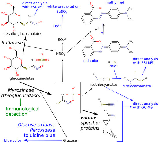 Full characterization of enzymes requires purification during which activity is usually monitored by a routine, specific assay. Purification of enzymes with this activity was successful from several sources, including various Brassicaceae plants [4,13,17,18], microorganisms [6,7] or insects [11,19]. Myrosinase assays usually detect either the decomposition of the substrate (glucosinolates), or release of one of the product compounds. The possibilities include direct detection of volatile products by GC-MS [20,21], measurement of the released acid (pH stat assay) [22], a decrease of concentration of the glucosinolate substrate via spectrophotometry or chromatographic techniques [23,24], or derivatization of the released glucose (Figure 1) via coupled enzyme reactions [25]. The detection of the enzyme by immunological methods [26,27,28] is also a viable option.