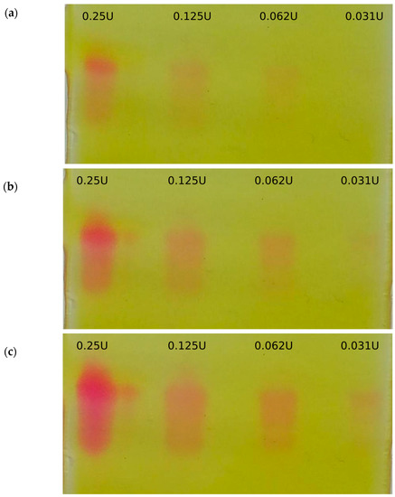 Short-term time course of the detectable on-gel signal—a serial dilution of myrosinase standard was detected with the proposed detection reagent containing sinigrin, 6 mM; ascorbic acid, 1 mM; Na2HPO4, 1 mM; pH 7.5; methyl red, 100 µg mL−1. 0.031–0.25 enzyme units (U) of Sinapis alba thioglucosidase (myrosinase) standard) was separated on 7.5% native PAGE. Subplots: (a) 4 min, (b) 6 min, (c) 8 min.