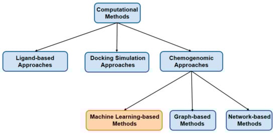To address the difficulties of traditional methods, chemogenomic approaches [15] have recently been performed successfully in drug discovery and repositioning on a large scale. There are four main types of target frequently involved in DTI prediction, namely protein, disease, gene and side effect. For the purpose of drug-target pair prediction, these methods integrate both the chemical space of compounds and the genomic space of target proteins into a unified space: pharmacological space. Hence, chemogenomic approaches can make full use of abundant biological data that is favorable for prediction. In such a DTI prediction problem, the major challenge is the scarcity of known drug-protein interactions and unverified negative drug-target interaction samples. These chemogenomic approaches can be classified into different categories, such as machine learning-based methods, graph-based methods and network-based methods [16]. Among all the chemogenomic approaches, machine learning-based methods have gained the most attention for their reliable prediction results. Most of these methods generally utilize the chemical and biological features of drugs and targets, and adopt various machine learning techniques to predict interactions between drugs and targets. Figure 1 is a branch diagram of recent computational methods for DTI prediction.