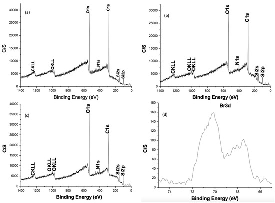 The XPS technique was also used to characterize the surface modification process via ATRP with polyacrylic acid. In this case, a solution of chitosan (1 mg/mL) was deposited onto a silica wafer surface using spin-coating technique and evaporated by rotating at 2300 rpm for 30 s. The resulting silica surface was used to carry out the modification process with the ATRP initiator, as described in the experimental part, and subsequently, the polymerization was conducted similarly for the chitosan particles. Figure 2 shows a typical wide-scan spectrum. Typical binding energy peaks for chitosan at 286.1 eV for C1s (69.13%), 534 eV for O 1s (24.66%), and 399 eV for N 1s (4.96%) (Figure 2a), the peak at 70 eV for Br 3d (1.25%) is observed after 2-BIB reaction, confirming the immobilization with the ATRP initiator (Figure 2b), high-resolution analysis of peak Br 3d is shown in Figure 2d [33,34]. However, after PA polymerization, the peak for bromine is absent, accompanied of an increment in the peak, due to O1s increased up to 33.89%, a consequence of the immobilization of poly (acrylic acid), while that the peak of C1s decreased to 56.26% (Figure 2c). The predicted percentage composition of a surface modified with chitosan would show that for carbon, would be around 54.53% and for oxygen 36.32%, very close to the values obtained for CS-g-PA, while it differs considerably from pristine CS. The absence of Br 3d in xps analysis (Figure 2c) still in the high-resolution analysis, shows that polymerization was carried out effectively [30]. Moreover, in an attempt to confirm the above, the CS was modified with PMMA, using the same procedure that for PA, and the surface was analyzed by XPS. Composition gave for the C1s 66.07%, N1s 4.33%, and for O1s 29.60%, very close to the predictions of a surface modified with PMMA that would give for carbon 58.80%, and 31.33% for oxygen, theoretically. These results agree with the findings by IR spectroscopy, confirming the immobilization of the polymer on the surface of the chitosan powder.