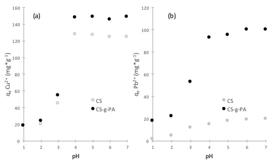 where is the initial concentration of the ion, is the concentration of the ion at time t, is the initial volume of the solution and m is the mass of the adsorbent. We studied the adsorption capacity (Figure 3) as a function of pH of lead and copper using chitosan (CS) and chitosan grafted-poly acrylic acid (CS-g-PA) prepared by SI-ATRP. Figure 3 illustrates two important aspects: first, an increase in the initial pH of the solution increases the maximum adsorption capacity for both, CS and CS-g-PA; however, adsorption capacity is much higher CS-g-PA than for CS. From pH 1 to 2, CS-g-PA had a slightly greater adsorption, possibly because the chitosan is unstable and tends to solubilize and the acrylate groups are protonated, exhibiting inefficiency to form complexes with ions. However, with the increase of the pH from 4.0–7.0, a dramatic increase occurs in the adsorption capacity of copper ions of CS and CS-g-PA, from 45.72 to 127.65 and 53.06 mg/g to 147.65 mg/g, while for the lead, an increase from 10.56 to 13.24 and 53.06 to 93.04 occurred. Above pH 4.0 it becomes apparent that more carboxylate groups are ionized resulting in an increase in the affinity for cations by electrostatic interactions [35].