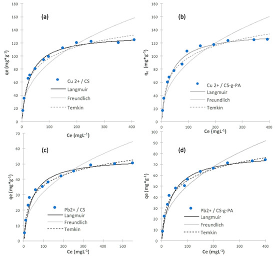 where, qe,cal is the calculated value, qe,meas is measured value and n is the number of data points. This model to error analyses were applied by other authors in order to verify which model presented better isotherm adjustment for chitosan and rice husk ash dye adsorptions [46,47]. Figure 4 and Table 2 show that for both metal ions, the Langmuir model fits the experimental results better the than the Freundlich and Temkin models, (largest R2 and fewer ARE values); furthermore, Figure 4 shows that the maximum Pb2+ adsorption capacity (qm) increased from qm = 54 mg/g to 81 mg/g after the grafting process. For Cu2+, adsorption capacity (qm) showed a little improvement from qm = 133 mg/g to 136 mg/g, after the grafting process. Our results indicate the grafting process improves the maximum capacity for Pb2+ and Cu2+ ions (additional information can be found in supporting information).
