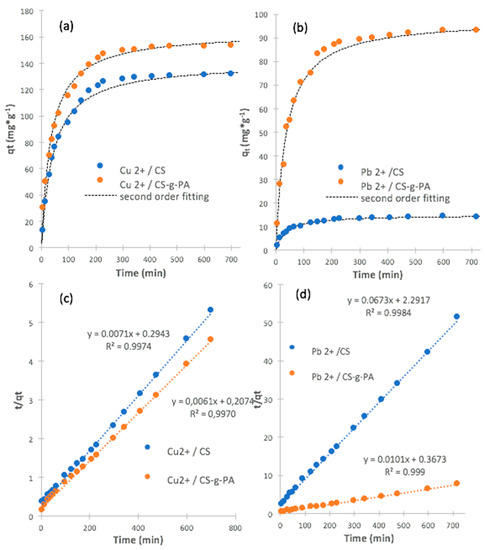 The study of adsorption kinetics is important to provide some information about the rate and mechanism of adsorption [70]. Figure 5 shows the variation in the adsorbed ions amount (qt) as a function of time. The rate of adsorption, for both ions, is high at initial times of adsorption. For both metals, most of the adsorption takes place within the first 100 min, using CS or CS-g-PA; however, after this time, we obtained near of 97% of the maximum adsorption. The sorption process is dependent on the sorbent characteristics such as the number of functional groups, porosity and amount of available sorption sites [71]. The pseudo-second order model is used to study the adsorption data; this model follows Equation (6) [72]: