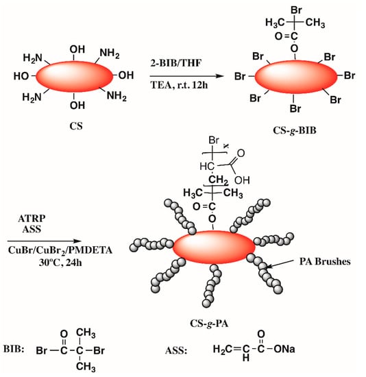 The ATRP initiator was grafted on the surface of chitosan (Scheme 1) using a modified reported procedure [75]: Five g of chitosan (deacetylation degree of 85%, medium molecular weight, Sigma-Aldrich) were added to a schlenk tube containing a solution of 25 mL of Tetrahydrofuran anhydrous (Sigma-Aldrich,) and 0.5 mL of triethylamine (99%, Aldrich). The tube was immersed in an ice bath and sealed using a septum. The content was gently stirred using a magnetic bar and purged with N2 during 30 min after what, 0.5 mL of 2-bromoisobutyryl bromide (2-BIB) (Sigma-Aldrich) was added under nitrogen dropwise placed in an ice bath. The reaction was removed from the ice bath and allowed to warm to room temperature and react overnight. Chitosan grafted BIB (CS-g-BIB) was filtered and washed extensively with THF, methanol and deionized water (DI), and allowed to dry in a vacuum oven at 40 °C for 48 h. 0.5 g of CS-g-BIB was carefully added to another schlenk tube with 21.51 mg (150 μmol) of CuBr (Sigma-Aldrich) and 3.35 mg (15 μmol) of CuBr2 (Sigma-Aldrich), sealed with a septum and flushed with N2 for 40 min. In a second Schlenk tube, 1.0 g (10.63 mmol) of sodium acrylate (Sigma-Aldrich) was added to a mixture of 111 μL (0.530 mmol) of N,N,N′,N″,N″-pentamethyldiethylenetriamine (PMDETA) and 17.5 mL of DI/methanol (1:1). The contents were gently stirred and degassed with nitrogen for 40 min and transferred using a cannula to the first tube. The polymerization proceeded for 24 h. CS-g-PA was washed with DI water in an ultrasonic bath, centrifuged and dried after water discard. The resultant chitosan was washed with large amounts of deionized water and followed was immersed in an acidic solution (0.1 M HCl) to remove any physically adsorbed reactant and to protonate the acrylic acid groups (ion exchange between Na+ to H+). Finally, the CS-g-PA obtained was dried in a vacuum oven at 40 °C for 48 h and stored in a desiccator for subsequent use [31].