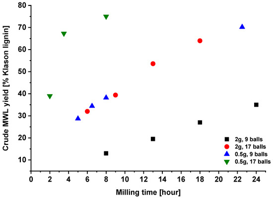 Milling duration is not the only variable affecting the yield of MWLc. For the same milling equipment used, the sawdust load in the milling jar and the number of balls used had strong effects on the yield (Figure 1). As only selected samples were analyzed for the carbohydrate content and the data was not available for all MWLc, the yield of MWLc was not corrected for the carbohydrate amounts in the sample. Milling time plotted included only true milling, without pause between milling cycles. As the number of balls increased and the amount of material decreased, a certain yield was reached within a shorter period (Figure 1). More balls and less wood content assure shorter milling durations to reach the target yield. Inert ball and container materials, such as zirconium oxide, should be preferred to avoid contamination with metal ions. The milling cycles applied and the ball material also affect the yield, as well as the ball size and humidity of the material. In the present study, we selected the following MWLc samples: P-20 (2 g sawdust, 9 balls, 13 h milling), P-38 (0.5 g sawdust, 9 balls, 8 h milling), P-32, P-39, and P-54 (2 g sawdust, 17 balls; 6, 9 and 13 h milling, respectively), P-67, and P-75 (0.5 g sawdust, 17 balls, 3.5 and 8 h milling, respectively). Therefore, we followed the work by Fujimoto et al. [14] to reflect milling severity, and hence, have related all our data to the corresponding yield of the isolated MWLc preparation.