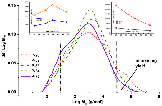 Molar mass distribution in relation to the crude lignin yield. Inserts: Corresponding statistical moments Mn and Mp (left) and Mz and Mw (right).