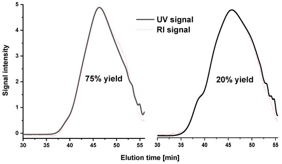 Comparison of chromatograms (UV vs. RI traces) for a 75% crude lignin yield (left) and a 20% crude lignin yield (right).
