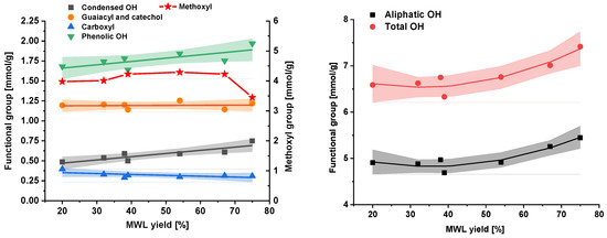 Functional groups of crude MWL depending on the milling yield. Shadowed areas indicate the 95% confidence interval.