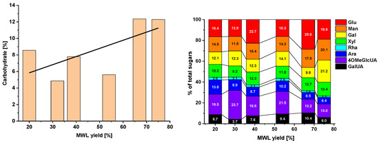 Carbohydrate contents (left) and distributions of individual sugars (right) depending on the crude MWL yield.