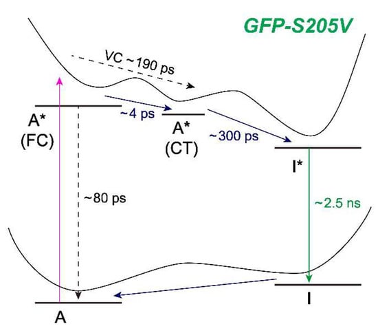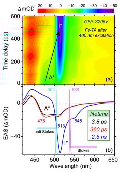 Figure 2b). Notably, in a time-resolved fluorescence up-conversion experiment on GFP-S205V monitoring the A* emission at 470 nm [
