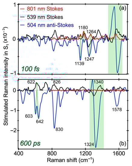 Figure 2b), with the Raman probe now located on the blue side (455–500 nm, i.e., anti-Stokes FSRS) [
