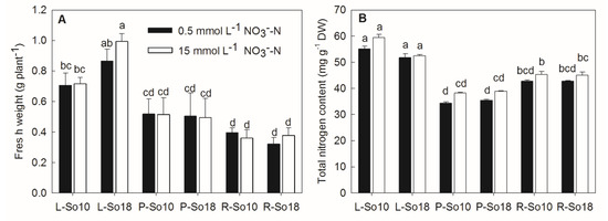 Fresh weights (A) and total nitrogen contents (B) of two spinach varieties (S10 and S18) after 12 h of nitrate treatment. L-So10, the leaf blades of S10; L-So18, the leaf blades of So18; P-So10, the petioles of So10; P-So18, the petioles of So18; R-So10, the roots of So10; and R-So18, the roots of So18. Different letters in columns indicate significant difference between the mean values at p < 0.05 by the LSD test (n = 3). Values are provided as mean ± SD.